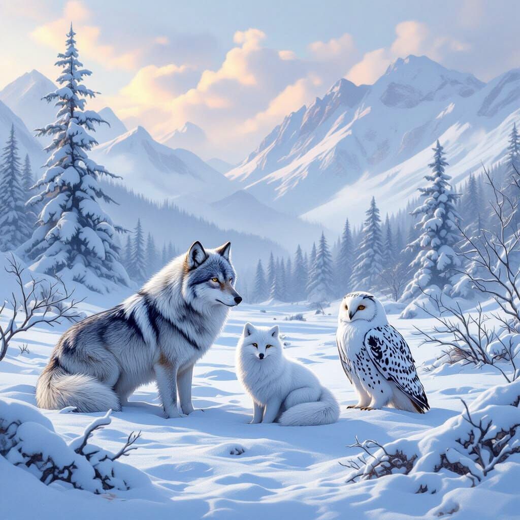 This image shows a wolf, arctic fox and snowy owl in a peaceful winter scene. The artwork is a highly detailed matte painting with deep, rich colors and fantastical elements in a digital painting style.