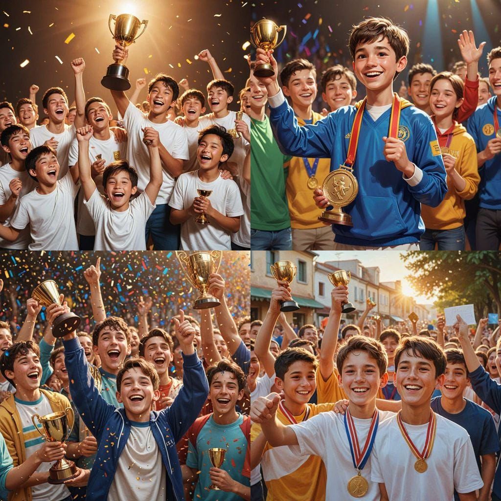 This image depicts a joyful scene of a boy proudly holding a medal trophy while his friends enthusiastically cheer and embrace him in celebration.