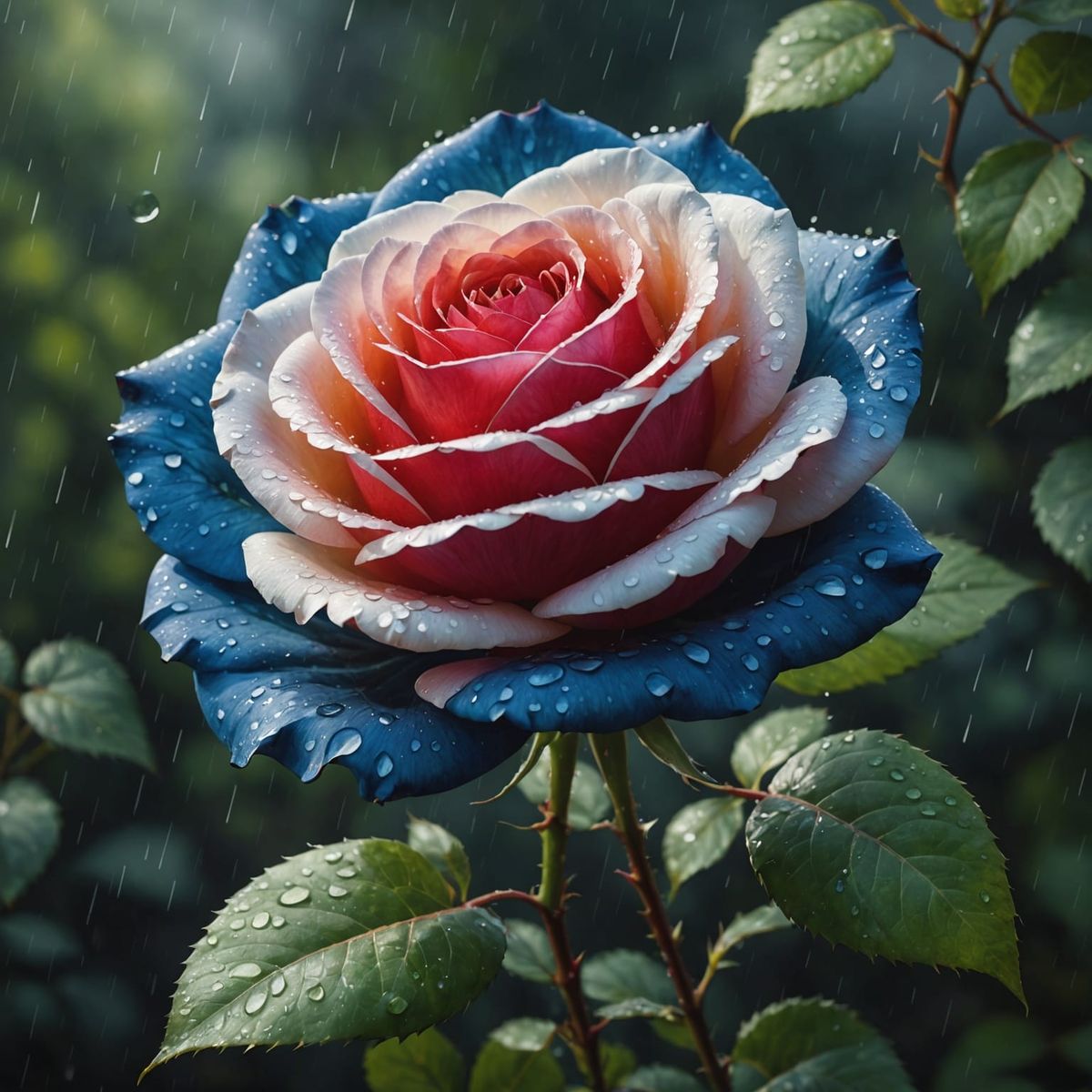 This image shows a vibrant rose in red, white, and blue watercolor. The rainy backdrop and soft lighting enhance the textured, ethereal quality in a complementary color palette.