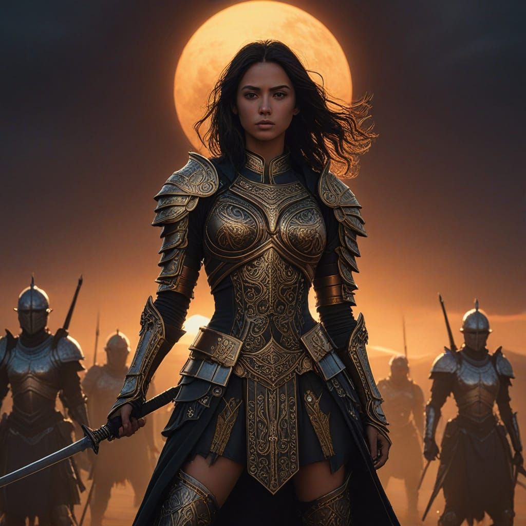 A heroic young woman stands strong, katana at the ready, amidst a backdrop of ominous soldiers and an impending desert storm, her armor and sword adorned with intricate patterns, bathed in vibrant, high-contrast light