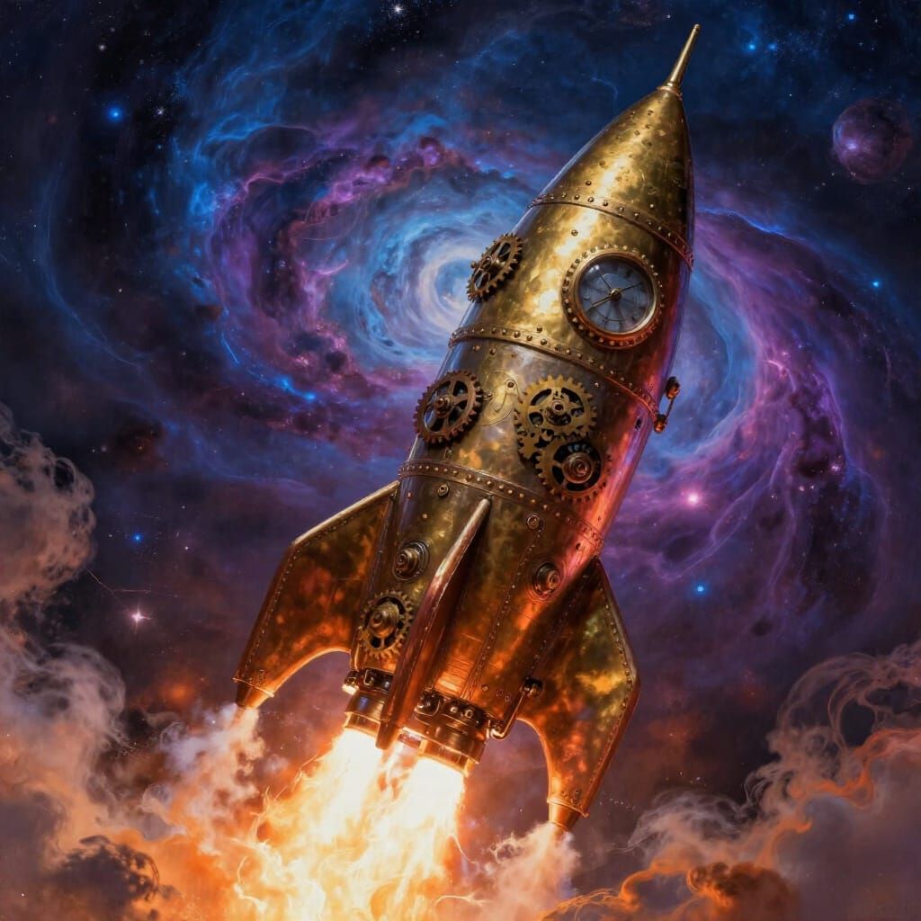 This digital painting showcases a magnificent brass and copper steampunk rocket ascending into a vibrant, swirling nebula with dynamic lighting and a cosmic color palette.