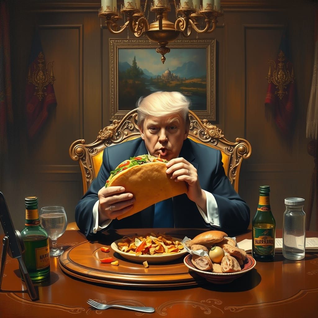 This image shows a realistic oil painting of Donald Trump enjoying a large taco at an ornate table. The artwork features warm lighting and intricate brushwork in an impressionistic style.