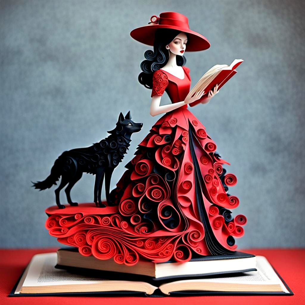 A striking picture of a woman in a red dress and black hat standing on a book in the woods. This fantasy art piece features intricate details reminiscent of paper quilling and high-contrast illustrations.