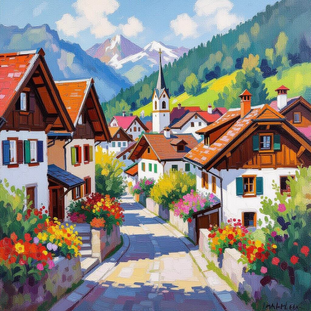 A picturesque Swiss village scene featuring charming chalet-style houses and a backdrop of vibrant flowers. The artwork evokes the style of early 20th-century art movements with bold colors and intricate details.
