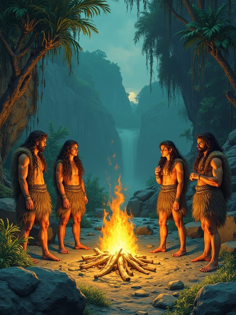 This image shows a gathering of prehistoric tribespeople in a lush, vibrant landscape, inspired by the style of Simon Stalenhag, with intricate details and a touch of fantastical world-building reminiscent of Frank Frazetta and Jean Giraud's Moebius