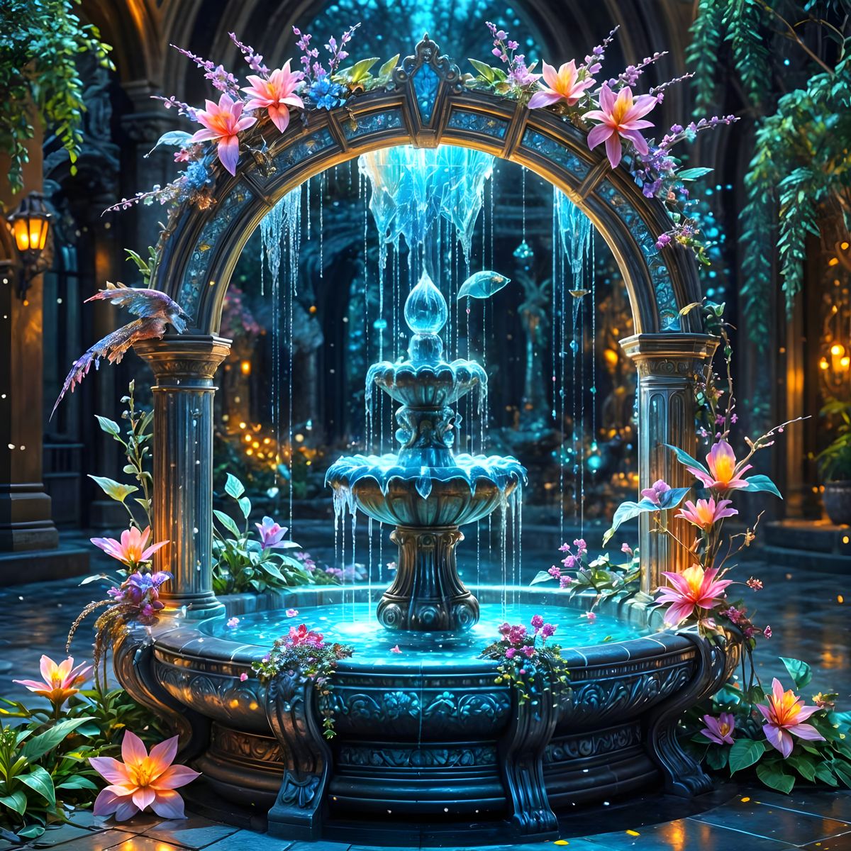 A beautiful fountain with holographic stained glass and blooming flowers is depicted in this image. The fountain is surrounded by glowing sparkles and rendered in a stylized watercolor aesthetic.