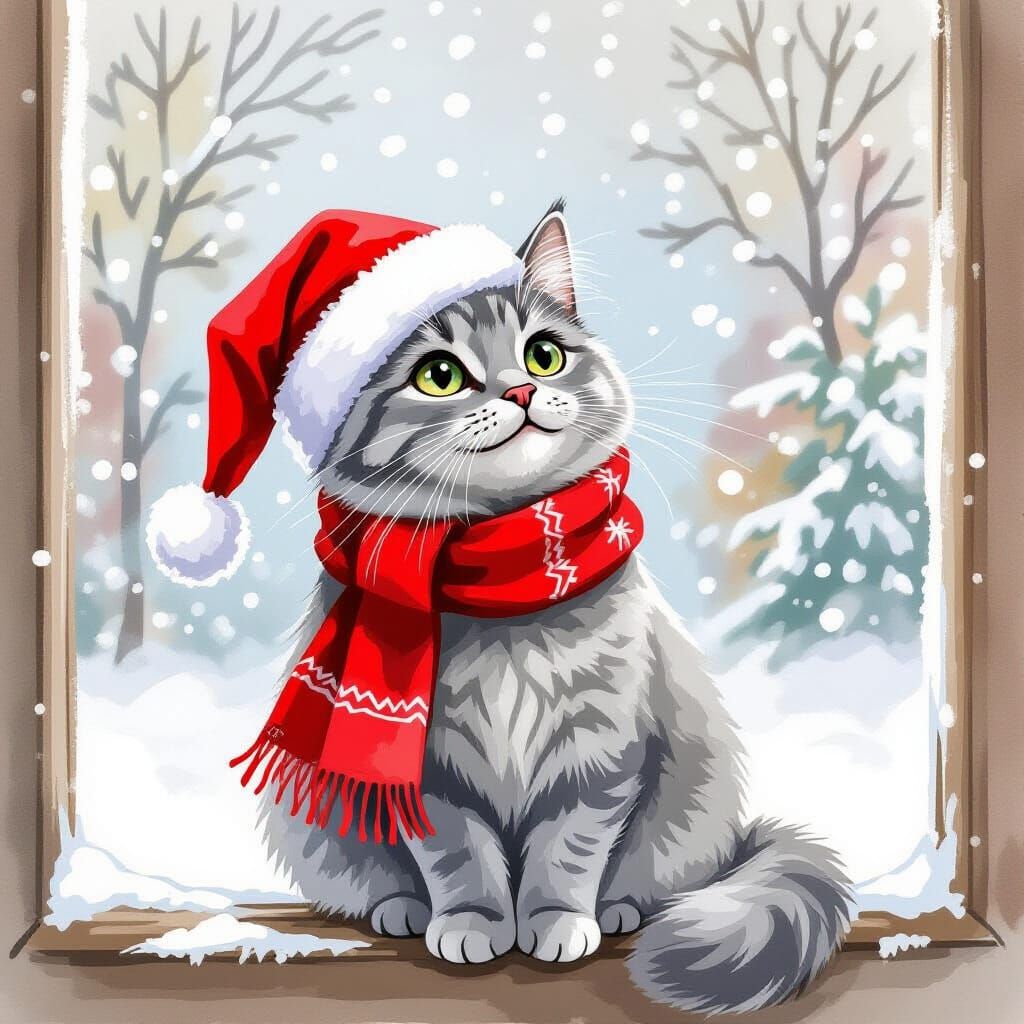 A charming watercolor illustration of a Chartreux cat with a bright red Santa hat and scarf, looking out at falling snowflakes. The artwork evokes a whimsical, dreamy aesthetic with delicate brushstrokes.