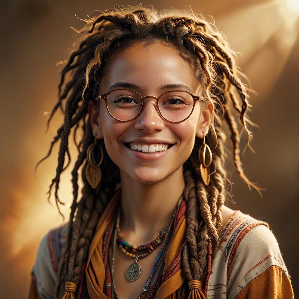 A striking picture of a smiling bohemian woman with dreadlocks, glasses, and a ribbon. Soft, warm lighting and earthy tones create a photorealistic painting with detailed textures.
