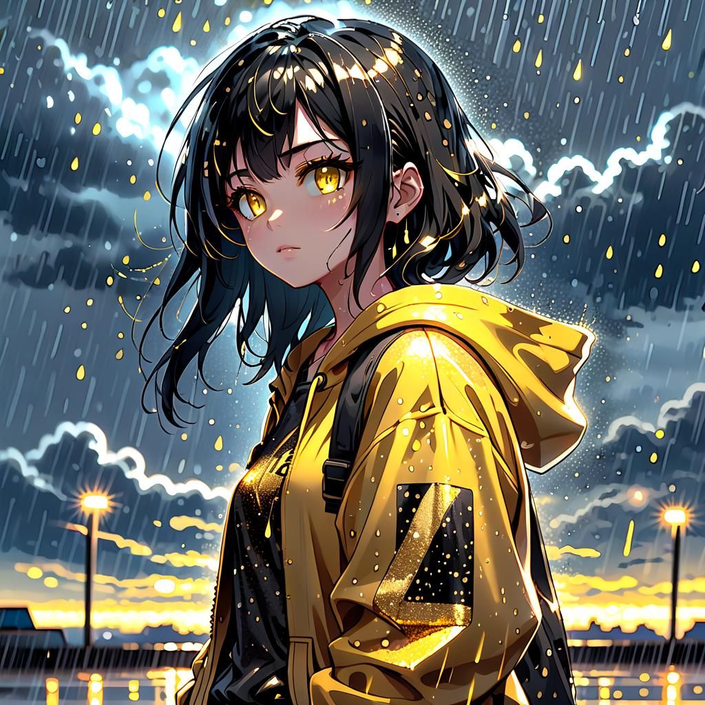 A stunning image of a teenage girl with choppy black hair standing in the rain. The scene is rendered with volumetric lighting and glittering gold rain in an illustrative style.