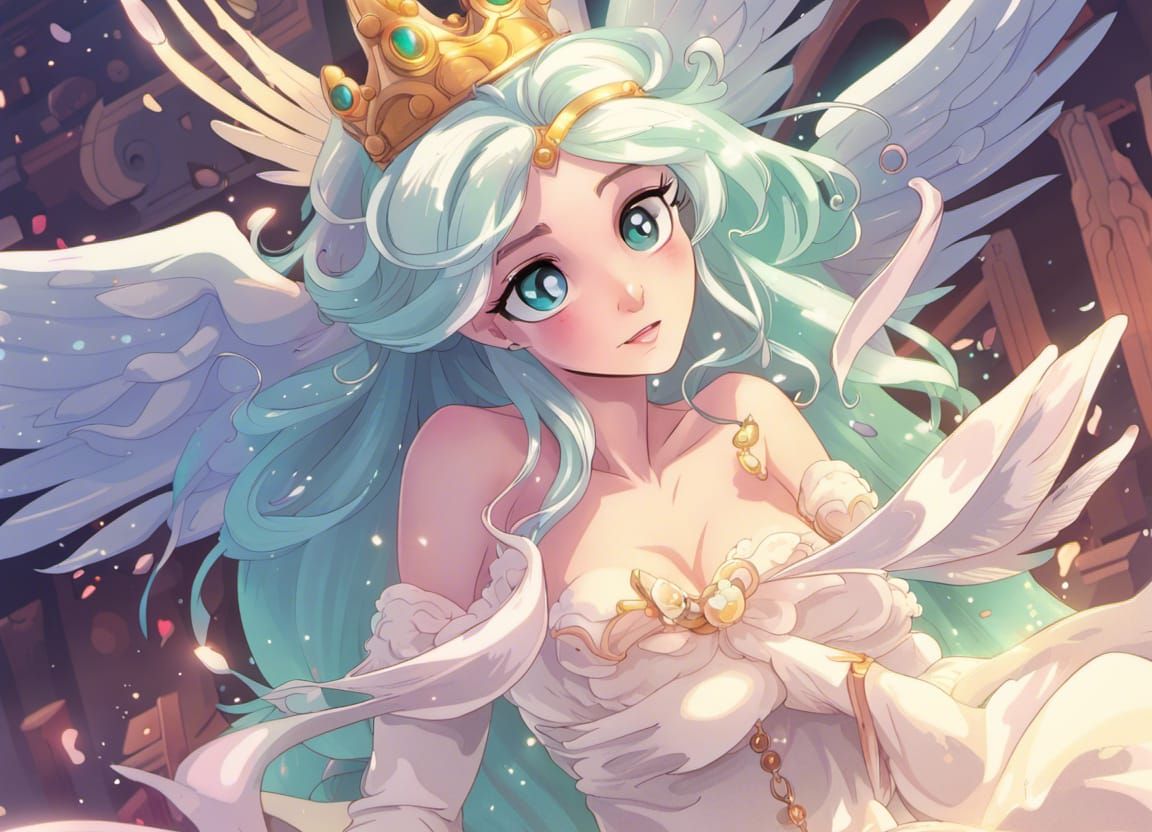 This image shows a full-body, overhead view of a human Princess Celestia from MLP. She is depicted with feathered wings, a crown, and a white dress in a Rococo art style.