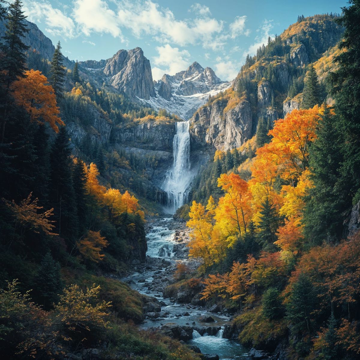 A stunning image of a mountain waterfall cascading through a pristine landscape. The scene blends autumn foliage with winter snows, painted with deep and rich colors.