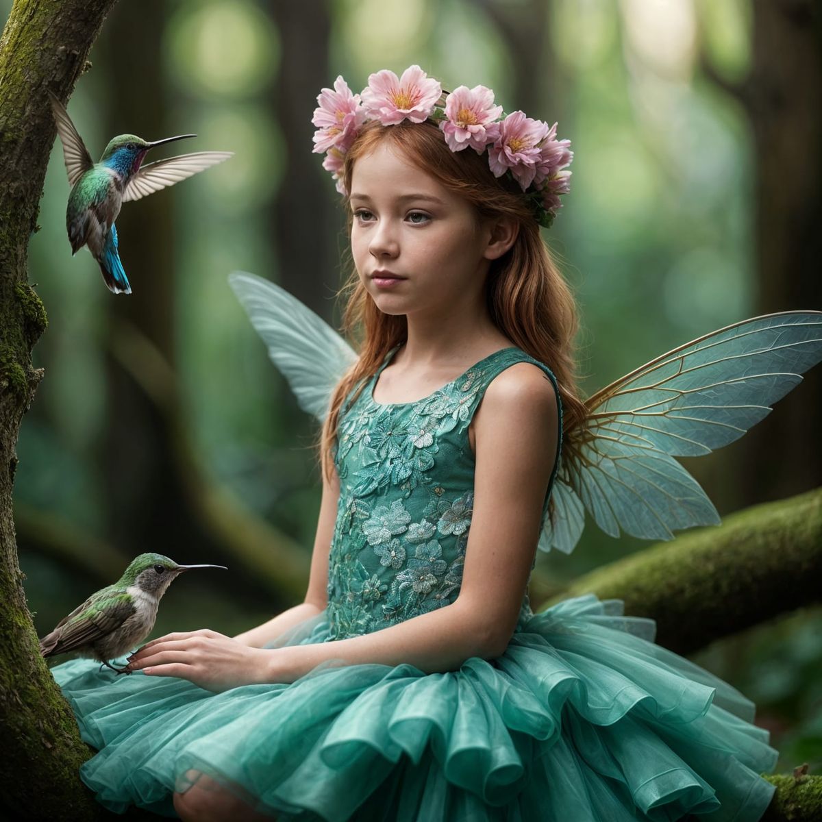 This image shows a fairy with brown hair and a flower crown sitting on a branch. The fairy is looking at a hummingbird with vibrant metallic plumage in a magical, dreamlike atmosphere.