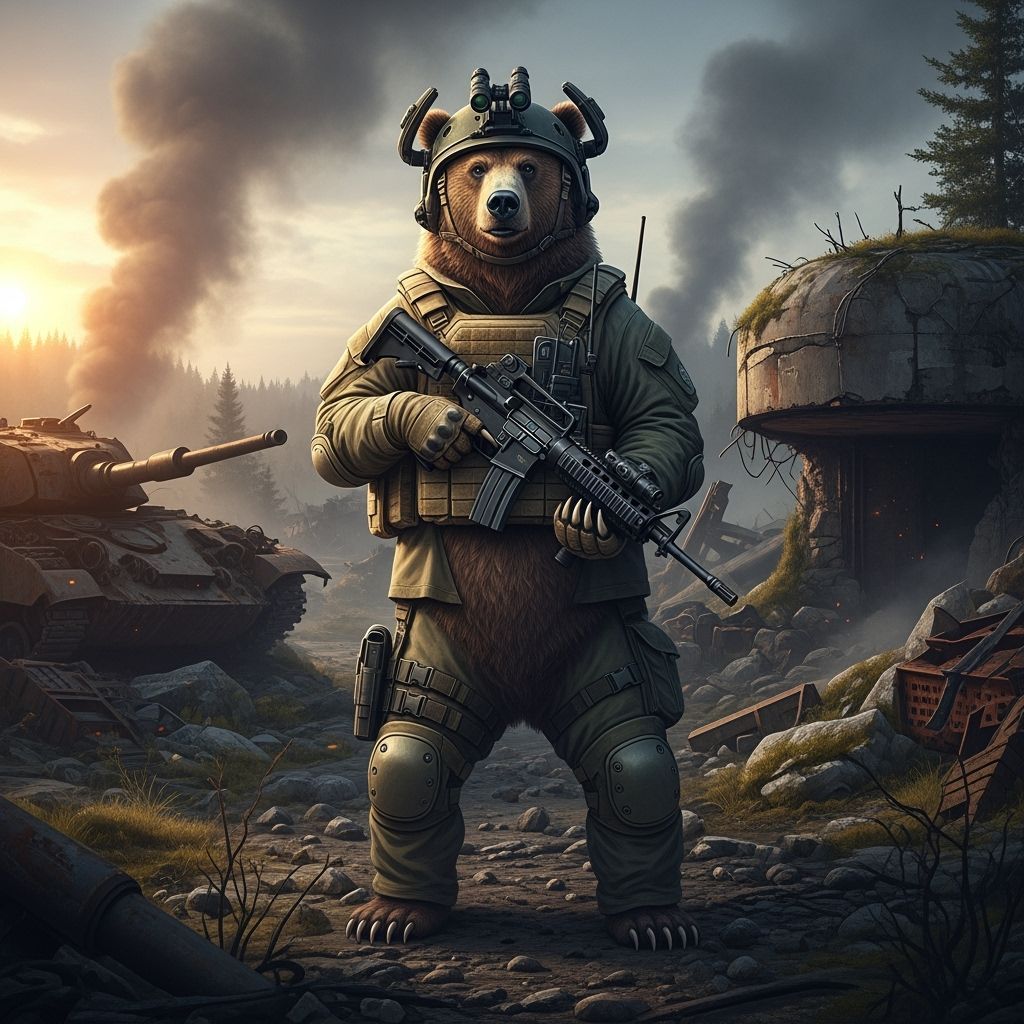 A realistic image of a grizzly bear soldier in tactical gear, holding an assault rifle in a war-torn landscape. The image blends nature and machinery with gritty realism.
