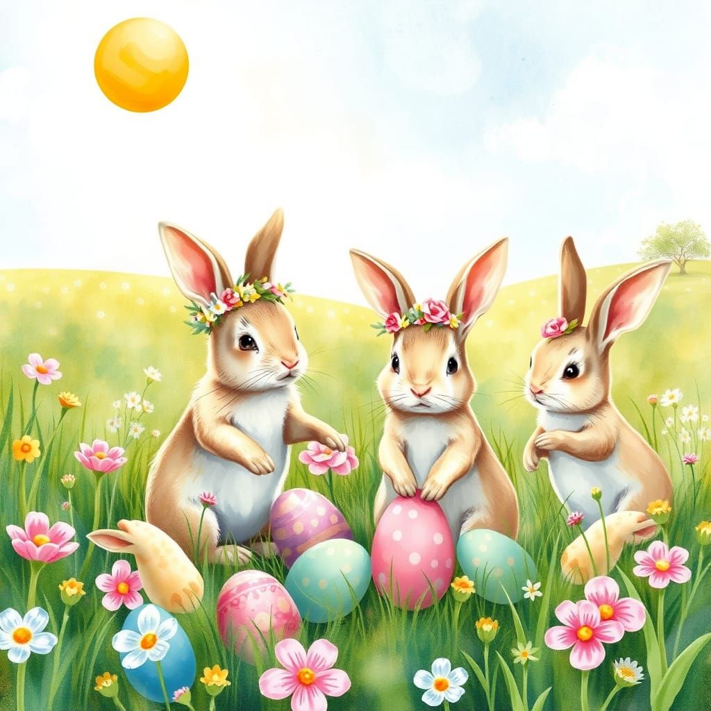 This image features adorable bunnies in a lush meadow, surrounded by Easter eggs and spring flowers, with soft watercolor textures and vibrant colors, reminiscent of classic children's illustrations.
