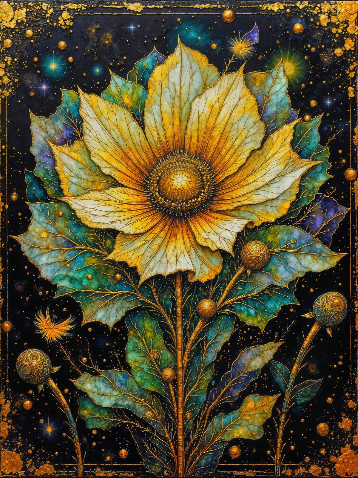 <lora:Painterly Magic:1.0> Burnished gold, alcohol ink, watercolour, black canvas <lora:Ancient Gold:1.0> A cosmic surreal of a botanical flora blossom dissolving into liquid fractals and geometric patterns, set against a backdrop of swirling nebulae and cosmic dust. <lora:MJ6 PainterlyFlux:1.0> Featuring ...