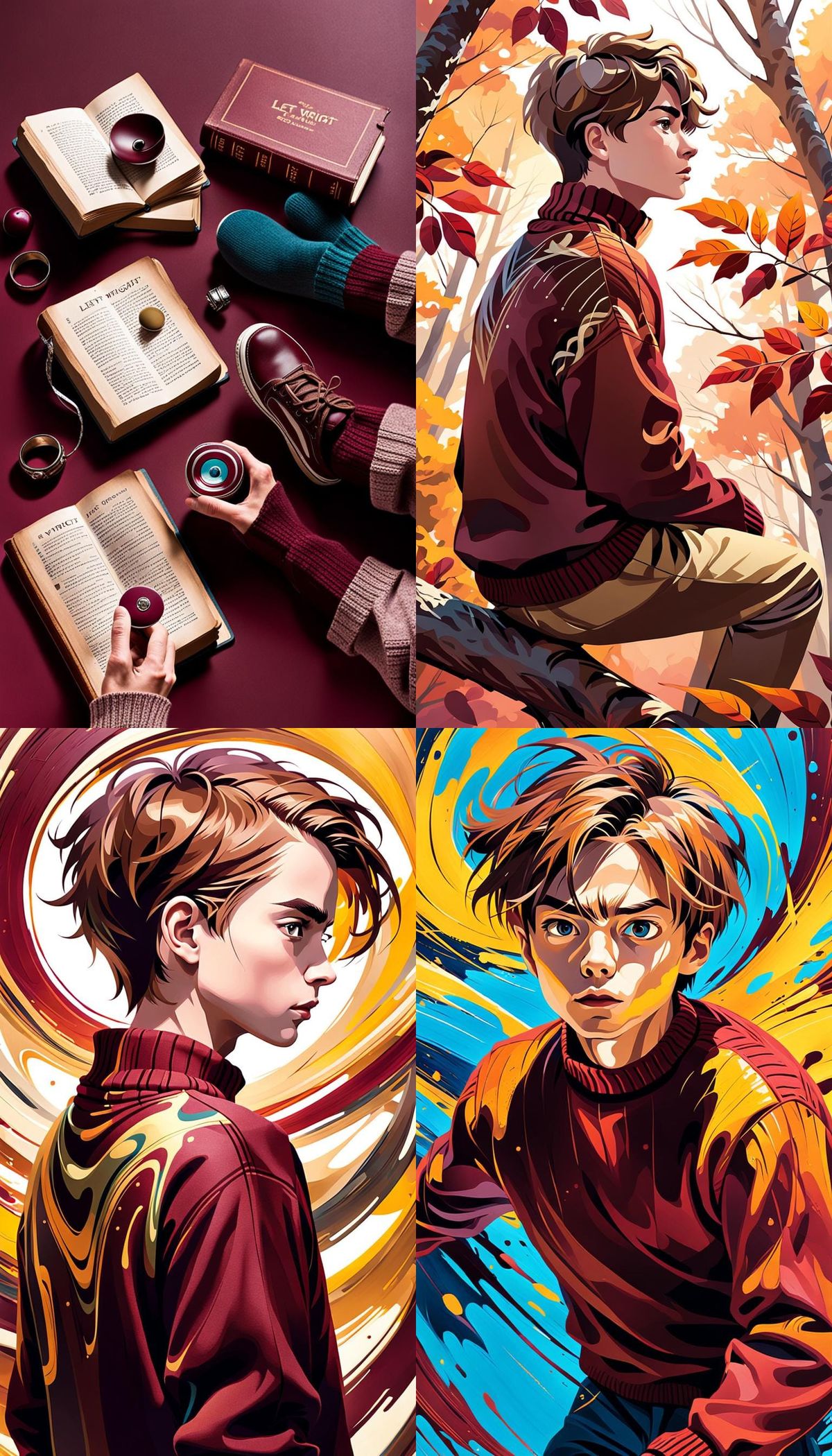 A vibrant abstract art piece featuring a brown maroon sweater. The artwork uses complementary colors and fine details to create a visually engaging composition.