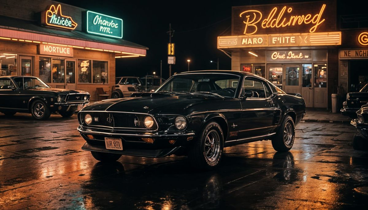 A cinematic film still of a midnight black 1969 Ford Mustang Mach 1 parked at a 1970s diner. Features moody lighting, chrome reflections, and film grain.