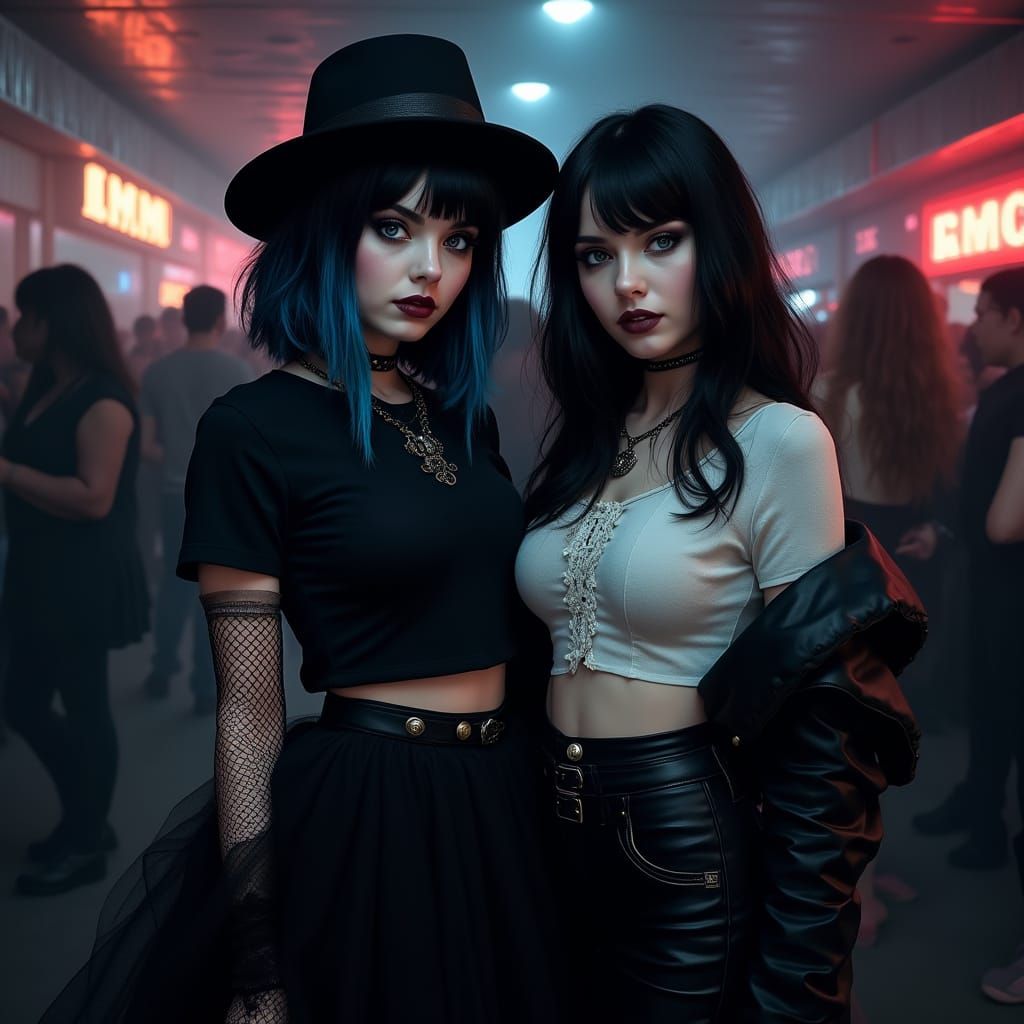 A striking young woman stands out in a crowded Emo club at midnight, wearing a black derby hat and bold black makeup. Her goth-inspired attire features a black band t-shirt, fishnet stockings, and a flowing black skirt, set against a backdrop of pulsating lights and dark textures.