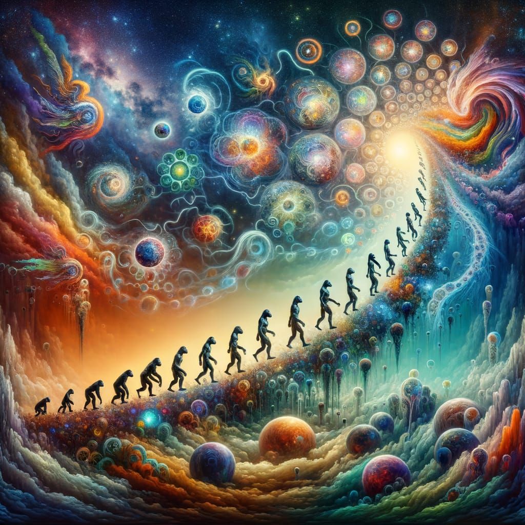 This image depicts the evolution of life from chaos to order, with colorful patterns and swirling shapes representing time and space. A grand universe backdrop signifies infinite possibilities and mysteries, with a symbol of enlightenment emerging from cosmic chaos.