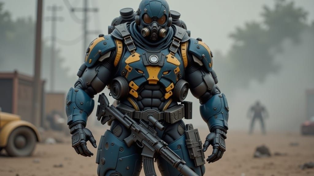 This image shows a full-body portrait of a muscular cyborg in a cobalt blue and yellow post-apocalyptic suit, wearing a gas mask and holding a machine gun. Gritty realism lighting highlights worn textures.