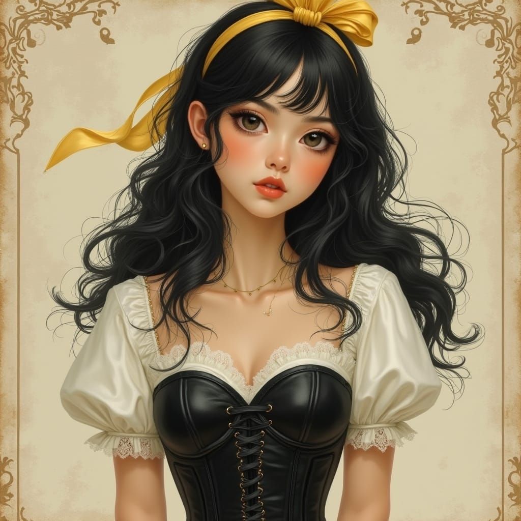 This image shows a young woman with flowing black hair wearing a leather corset and puffy sleeves. The style evokes a romantic, whimsical illustration with intricate details.