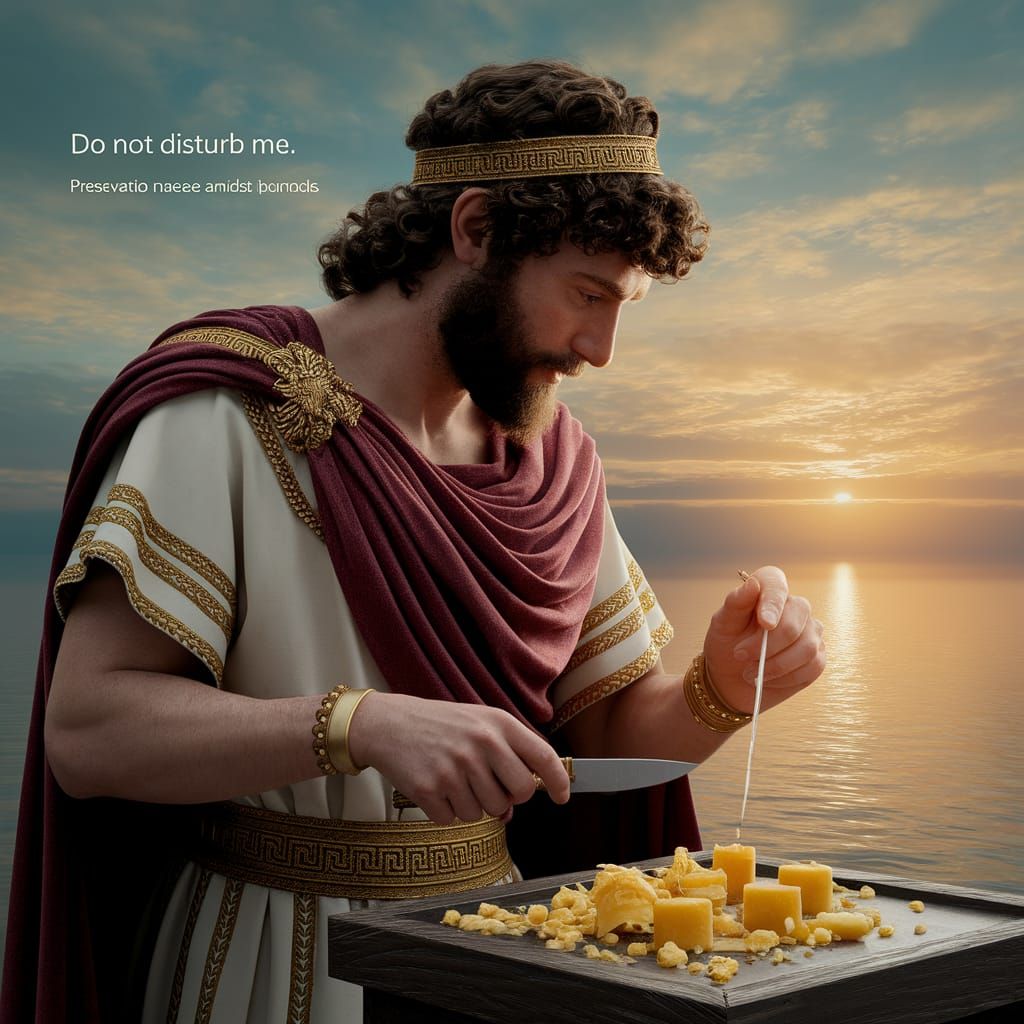 This image depicts a Greek explorer meticulously preparing beeswax earplugs. Bathed in the warm light of a sunset over a calm sea, the digital artwork captures a moment of quiet focus before an epic journey.