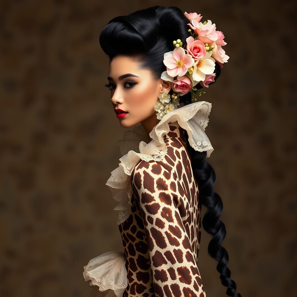A striking picture of a model in a giraffe-print jumpsuit. The outfit features lace embroidery and is accessorized with flowers in her updo, in an Alphonse Mucha-inspired style.