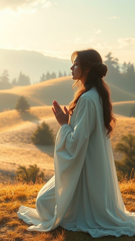 A captivating image of a woman in prayer amidst a tranquil landscape. Soft light bathes the scene, reminiscent of anime art with intricate details and delicate textures.