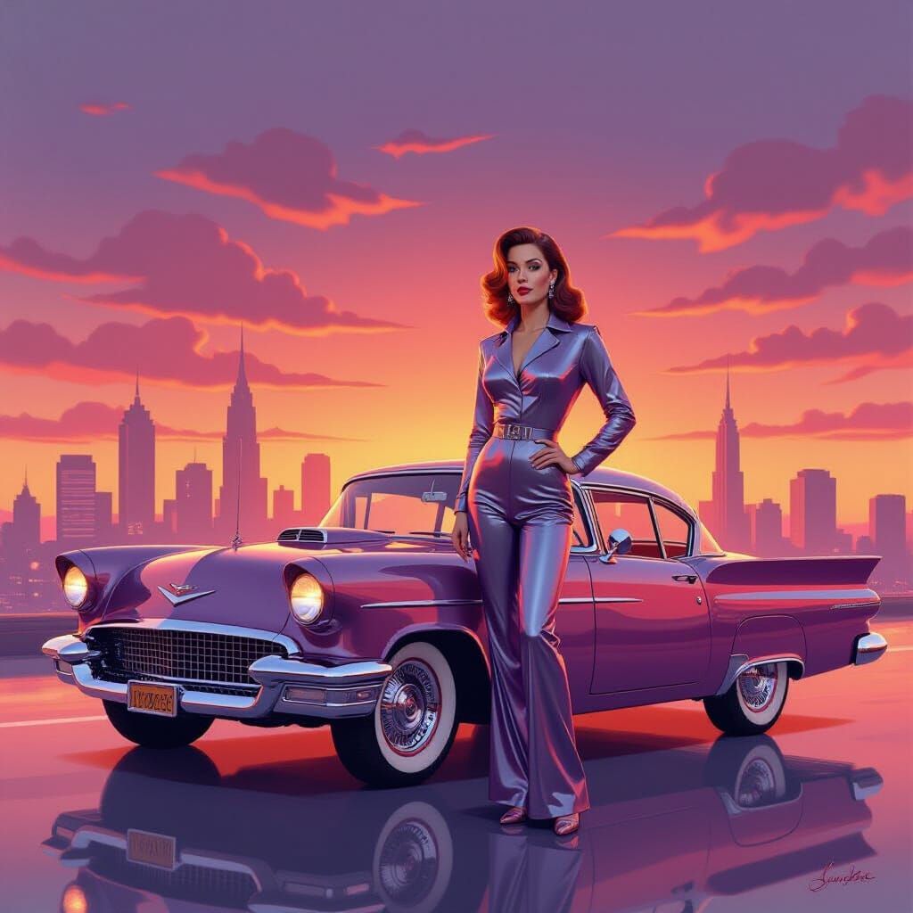 This image shows a woman in retro-futuristic attire standing next to a classic car. The backdrop features a city skyline at dusk with orange and purple gradients, rendered in a detailed airbrush style.