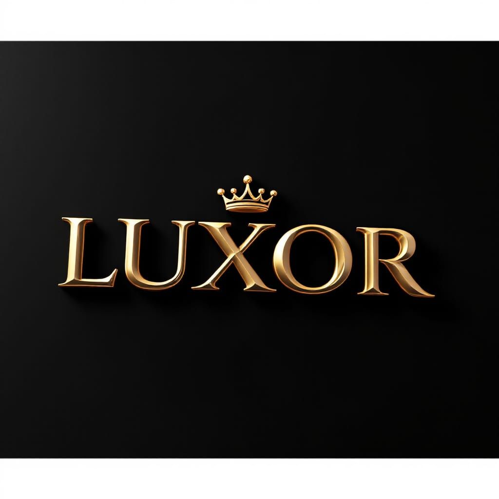 This image showcases an ultra-realistic 8K 3D logo for LUXOR, a luxury brand. Featuring metallic gold serif text with a crown emblem on a dark background, it has a sophisticated, high-gloss finish.