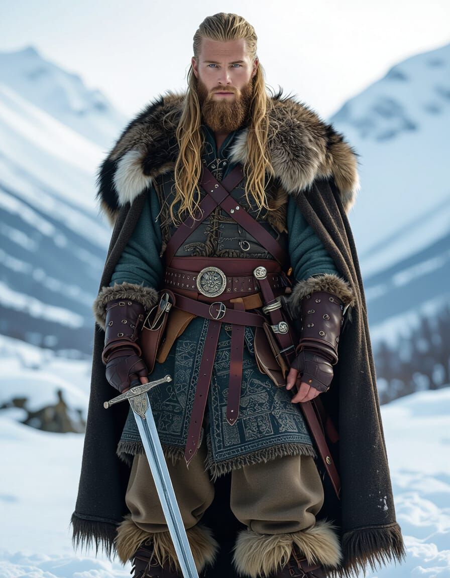 This image shows a blond, blue-eyed Scandinavian man in traditional medieval clothing. The man is holding a sword against a backdrop of snowy Norwegian mountains, realized with intricate details and textures in a realistic, photographic style.
