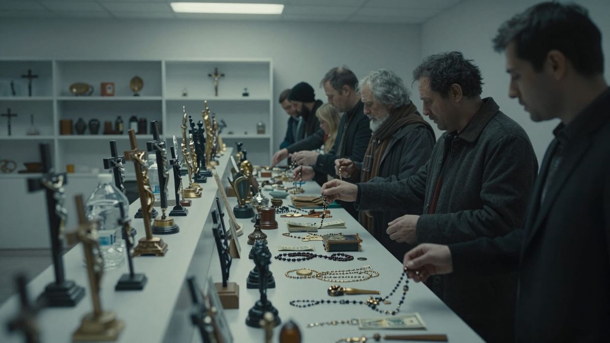 A haunting cinematic concept art depicting holy items sold as commodities. Hands of the poor reach out, while the wealthy purchase salvation, highlighting exclusion by design in a sterile, muted world.