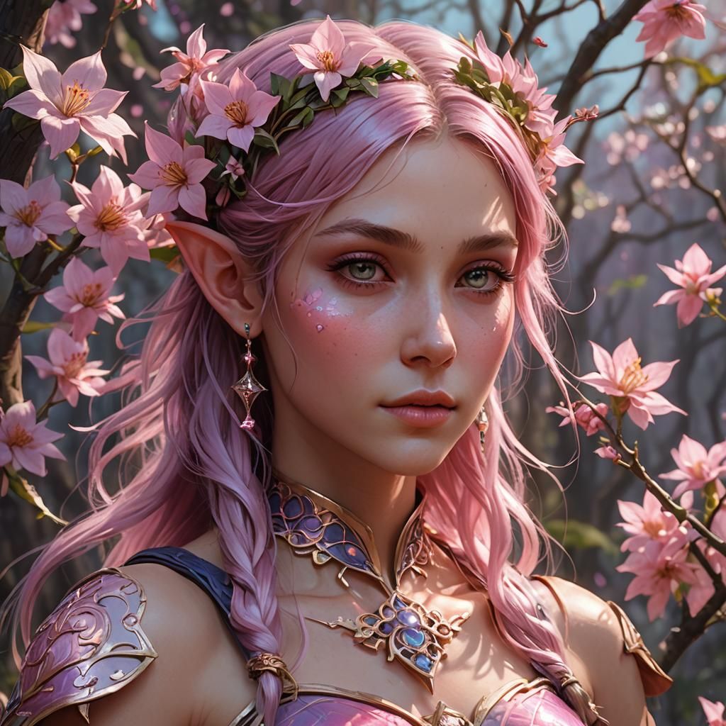 Beautiful female Spring elf, Stunning model, Fantasy Dream Art, full body image, perfect round face, colors pink and lila head and shoulders portrait, 8k resolution concept art portrait by Greg Rutkowski, Artgerm, WLOP, Alphonse Mucha dynamic lighting hyperdetailed intricately detailed Splash art trending ...