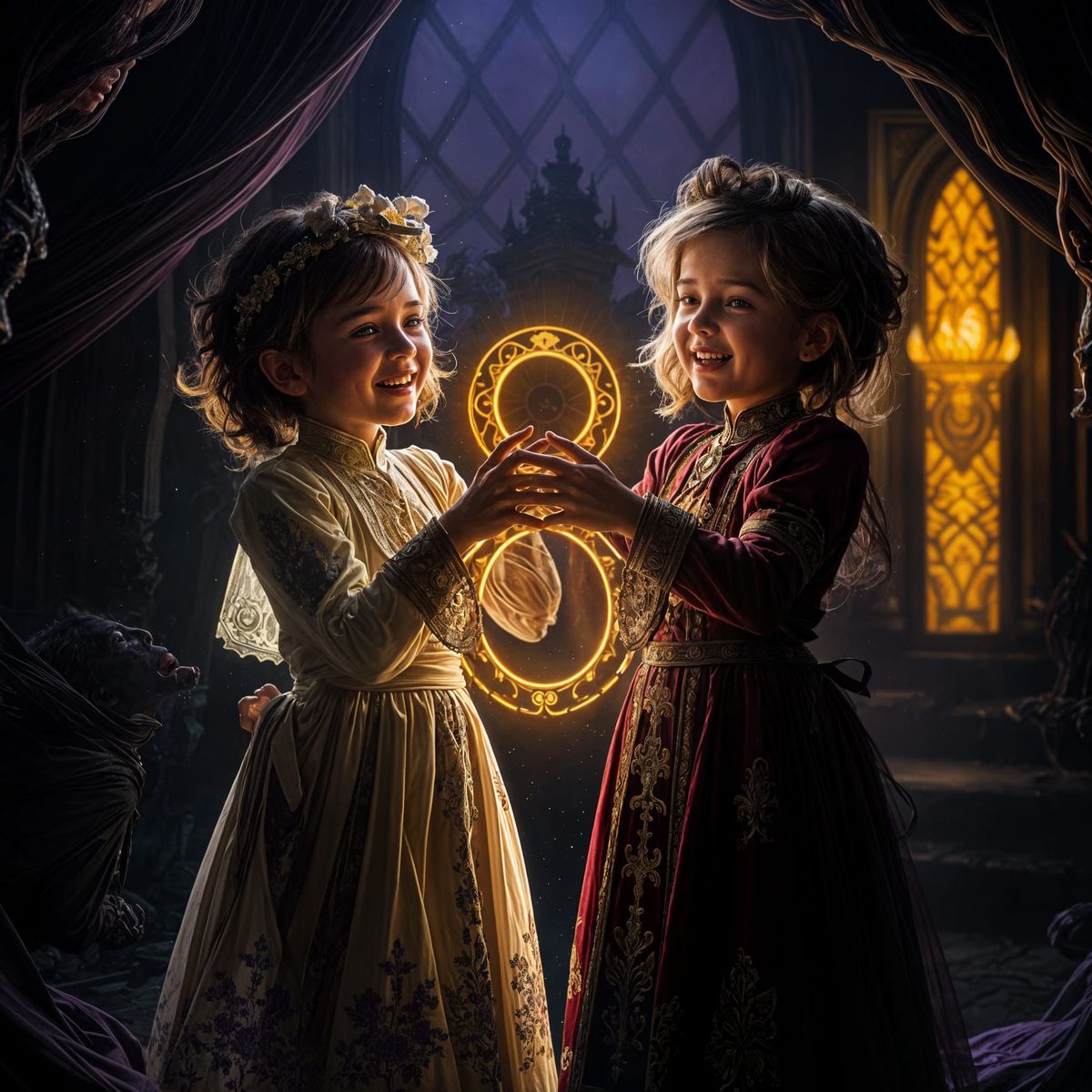 A vibrant 8k resolution artwork featuring two joyful children forming the number 8 with their arms, set against a deep, richly colored background with intricate details and dynamic lighting, evoking a sense of timelessness and wonder.