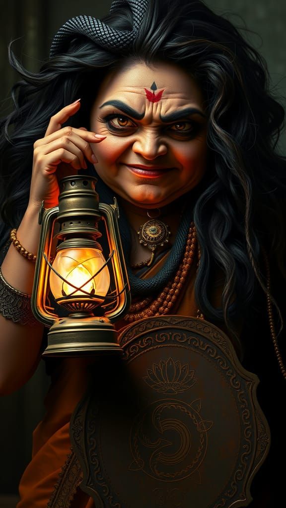 A hyperrealistic portrait of a Naga woman from Indian mythology, illuminated by an eerie, flickering lantern and surrounded by dark fantasy symbols. Her intense, otherworldly gaze and unsettling expression evoke an atmosphere of mystery and forbidden knowledge.