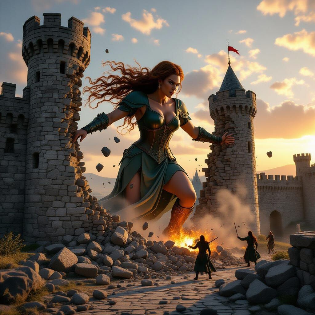 This hyper-realistic image shows a colossal giantess tearing a stone wall from a medieval castle. Cinematic lighting and a wide-angle perspective highlight the destructive power and immense scale.
