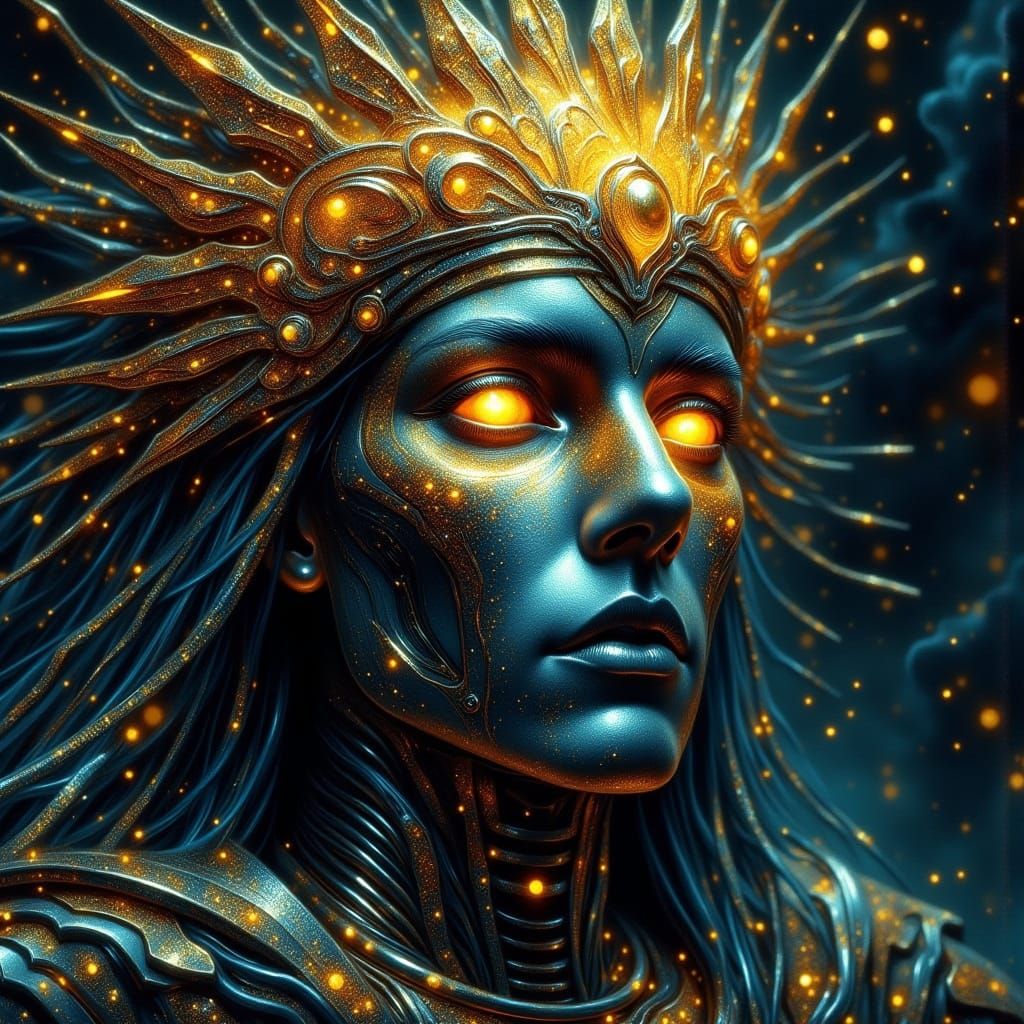 This image shows a majestic futuristic sovereign made of silicon and steel, emerging from digital darkness. A radiant diadem of gold eyes casts an ethereal light. Rendered in detailed digital concept art.