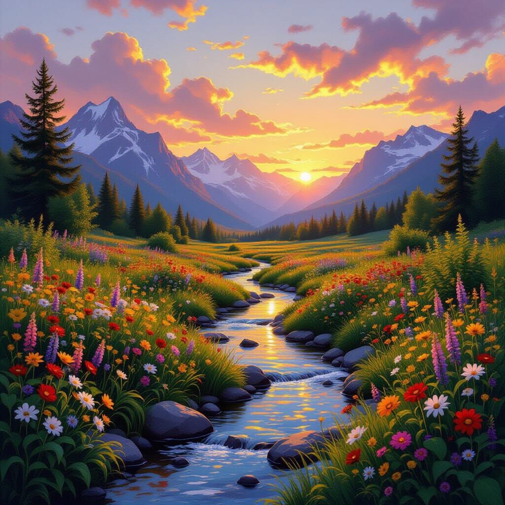 This image depicts a vibrant, lush garden filled with wildflowers and a stream, set against majestic snow-capped mountains under a colorful sunset. Rendered in a luminous, painterly style with golden hour lighting.