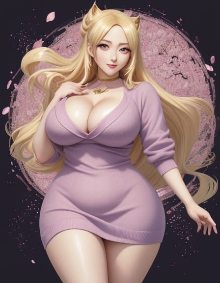 This vibrant image features a magical lady with a kawaii sweater dress, surrounded by sakura petals in card form, showcasing her curvy figure and exaggerated features, set against a backdrop of soft, golden lighting and maximalist colors, reminiscent of Japanese pop art and anime illustration.