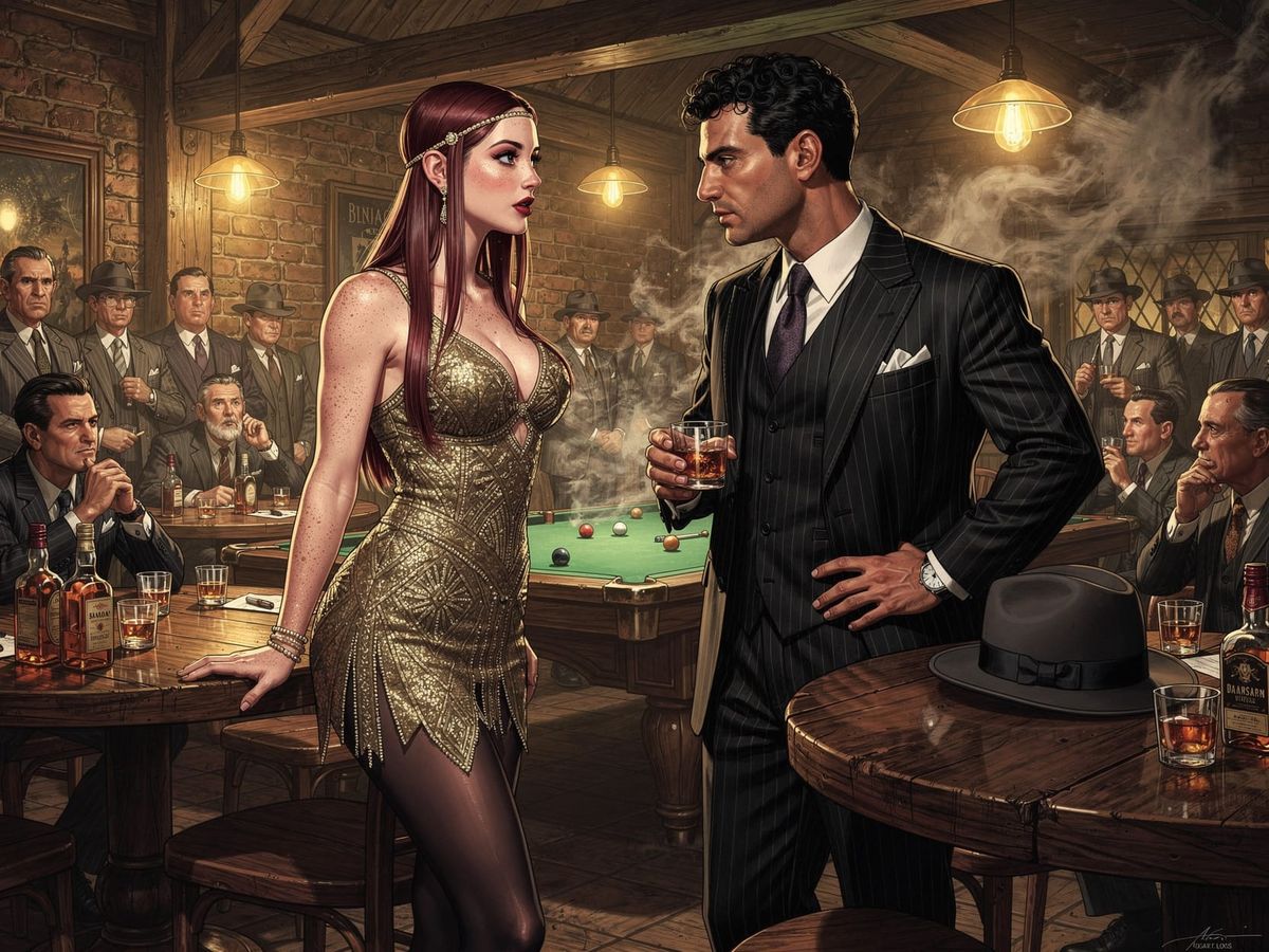 A detailed illustration of a short flapper woman flirting with mobsters in a dimly lit 1920s underground den, featuring Edison lighting and a speakeasy atmosphere.