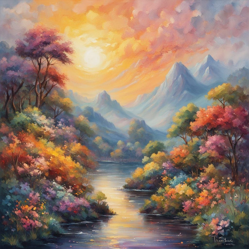 A vibrant gouache painting of an island bathed in soft light. The neo-impressionistic image employs thick brush strokes, textured paint, and a rich color palette to create a detailed, ethereal landscape.