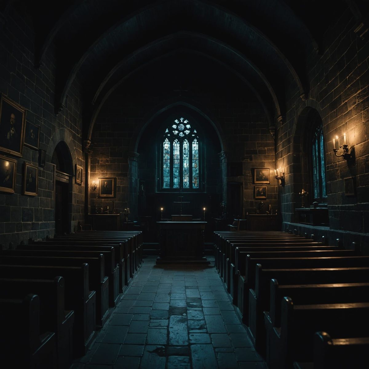 This image shows the dark interior of a small chapel at night. The scene is rendered with cinematic lighting and film grain, creating an atmospheric and dramatic composition.