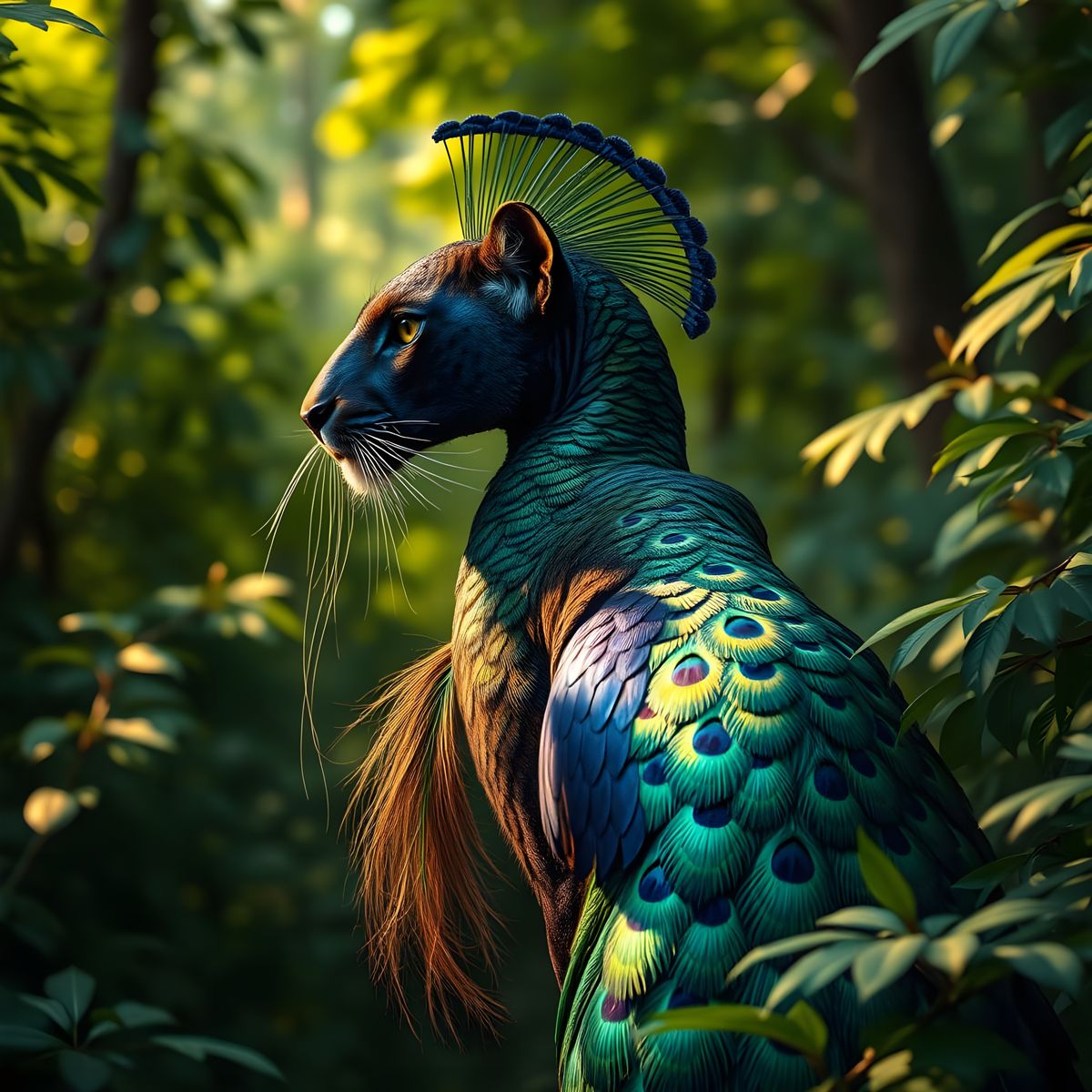This image shows a stunning, hyperrealistic portrait of a majestic feline-avian hybrid, with the body of a panther and the vibrant plumage of a peacock, set amidst a lush green forest backdrop.