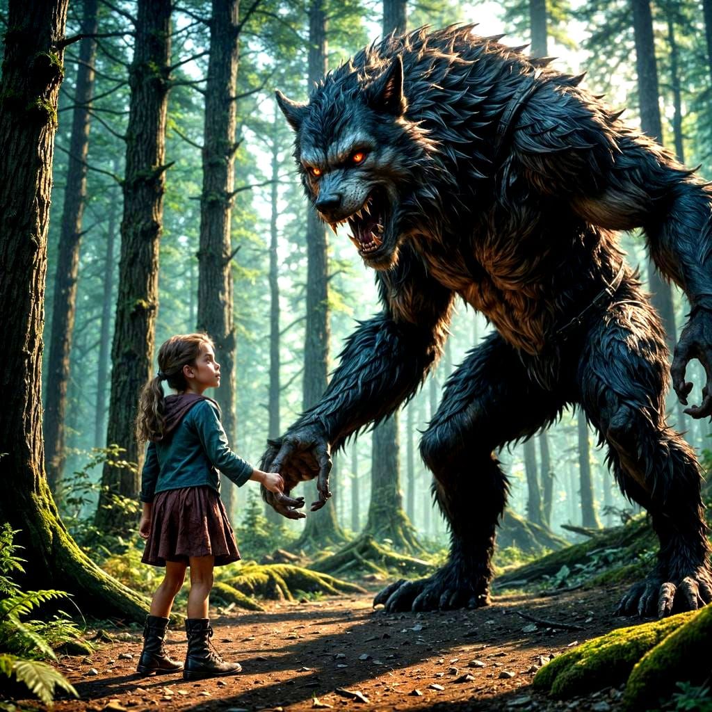 A fantastical image shows a huge werewolf curiously looking at a little girl in a dark forest. The scene is rendered with deep colors and intricate details, reminiscent of fantasy concept art.