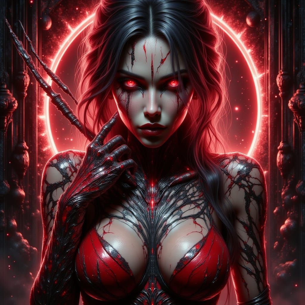 A vibrant image showing Harleen Quinzel in a red and black latex suit holding a whip. The aesthetic blends ornate symbolism with biomechanical and futuristic elements, using realistic textures.