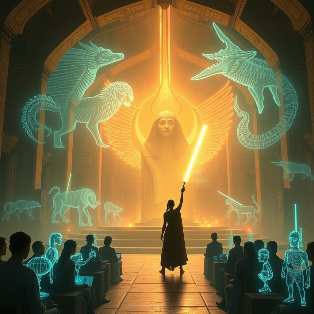 A digital painting shows Rey Skywalker in an Egyptian temple, presiding over a galactic court. Holographic witnesses and contracts fill the air as she confronts a giant, shadowy figure.