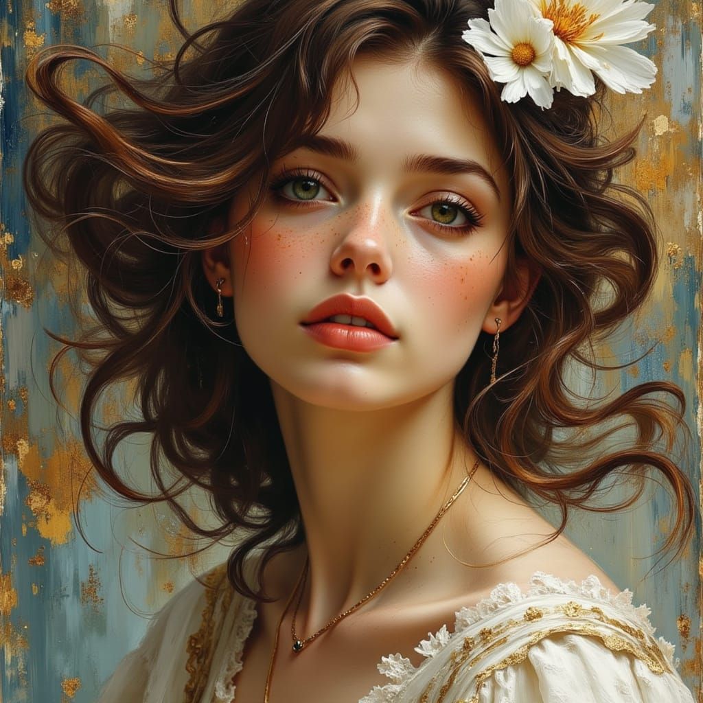 A digital painting of a beautiful woman with flowing hair and a dreamy gaze. This highly detailed fantasy art uses a rich, vibrant color palette to enhance the ethereal aesthetic.