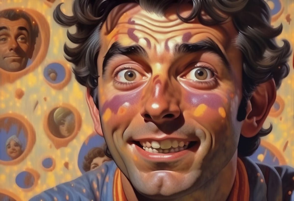 This striking image showcases a close-up of a man with a distorted expression, rendered in a unique blend of pixel art and synthwave-inspired lighting. Vibrant colors and deep shadows create a captivating scene, reminiscent of comic book art with surreal elements.