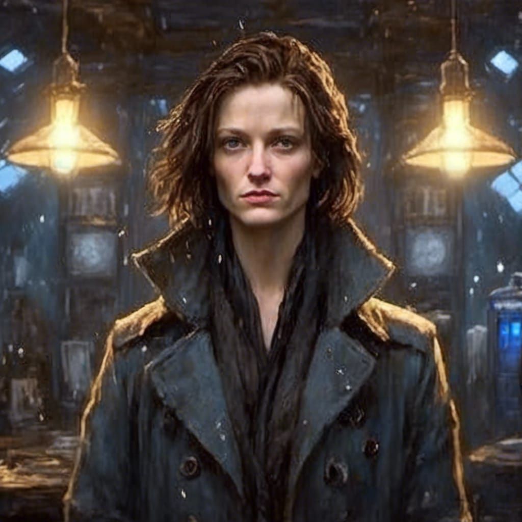This image shows a person in a futuristic trench coat in a phone box resembling the Tardis. The vibrant scene is lit with volumetric lighting and rendered as concept art.