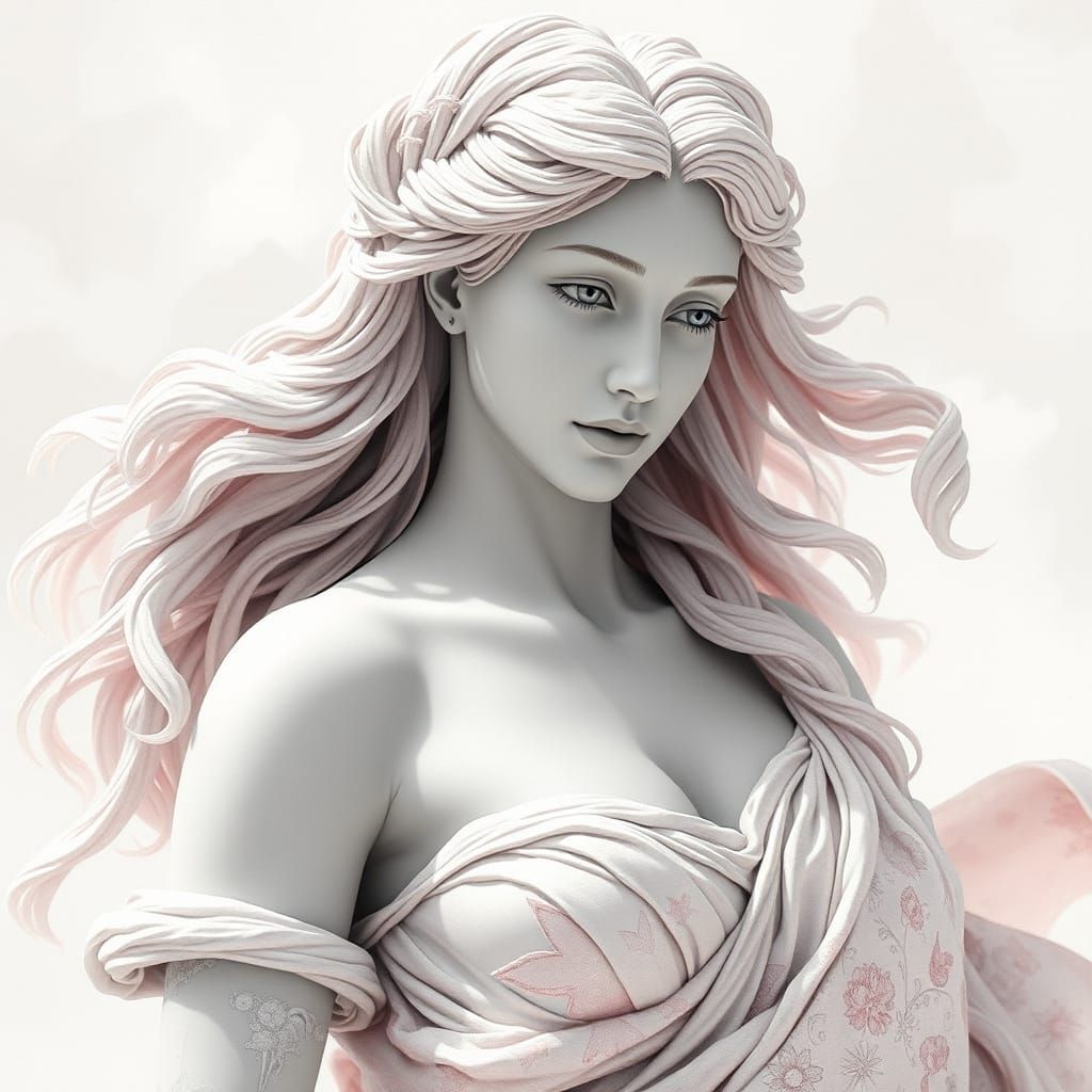 A monochrome portrait of the Greek goddess Aphrodite in light pastel watercolors. This 3D rendering evokes a cinematic feel with intricate details and dynamic lighting, reminiscent of a Botticelli painting.